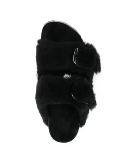 Arizona Big Buckle sandals from BIRKENSTOCK featuring jet black, shearling, double-strap design, open toe, double buckle fastening, open back, EVA midsole and flat sole.