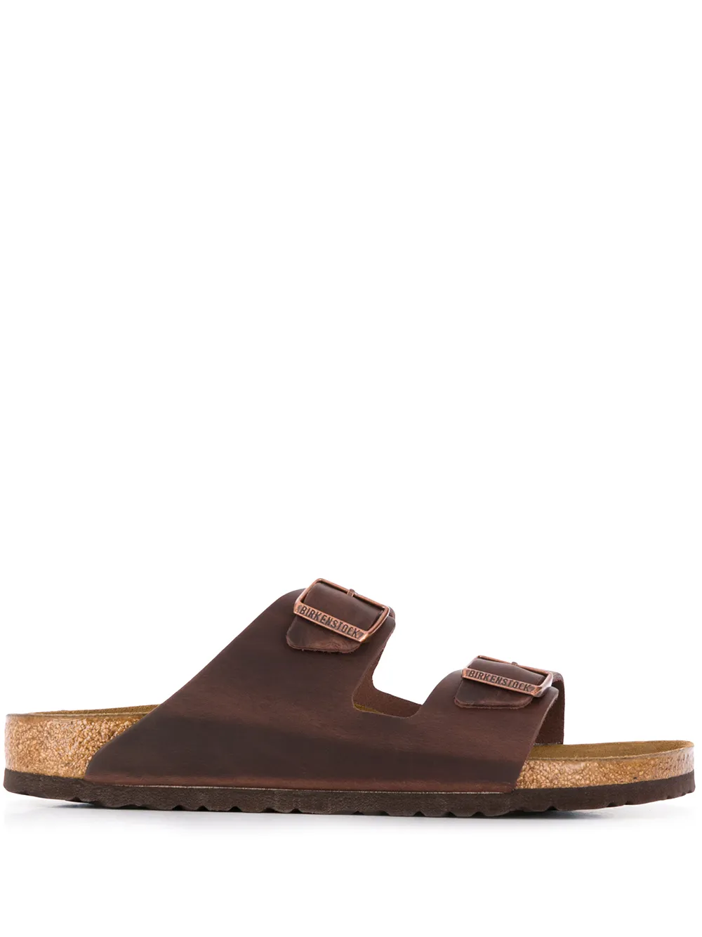 Chestnut-brown leather Arizona buckled sandals from BIRKENSTOCK featuring engraved logo, open toe, double buckle fastening, slip-on style, moulded footbed and ridged rubber sole.