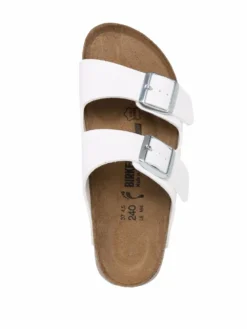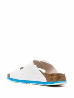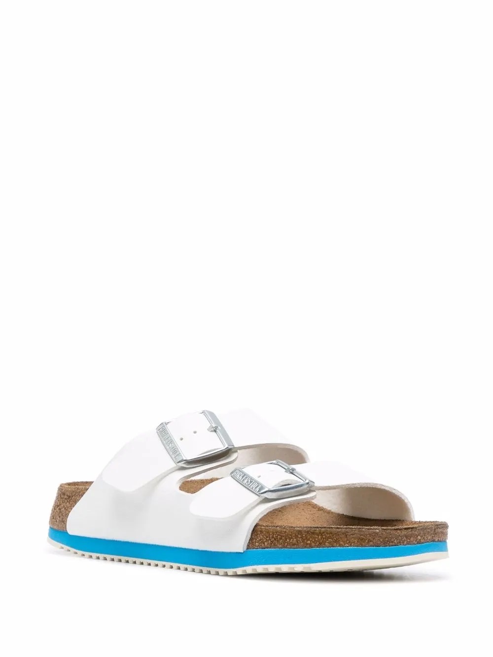 White / blue leather Arizona Super Grip sandals from BIRKENSTOCK featuring double-strap design, silver-tone hardware, double buckle fastening, open toe, branded insole and flat rubber sole.