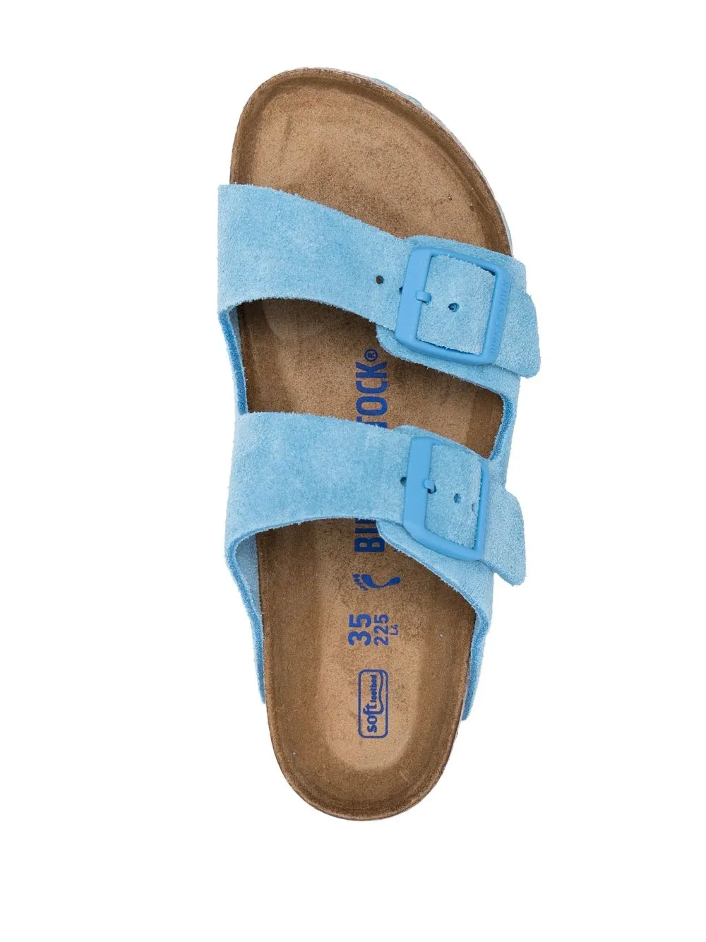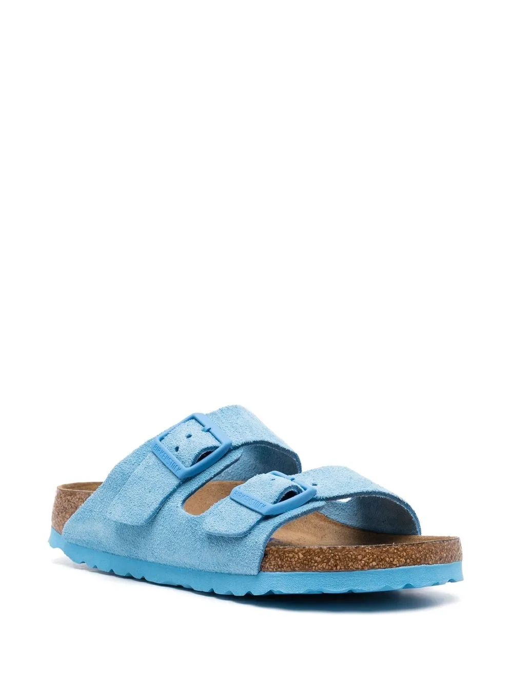 double-strap suede sandals from BIRKENSTOCK featuring sky blue, calf leather, double-strap design, open toe, buckle fastening, branded insole, cork sole and flat rubber sole.