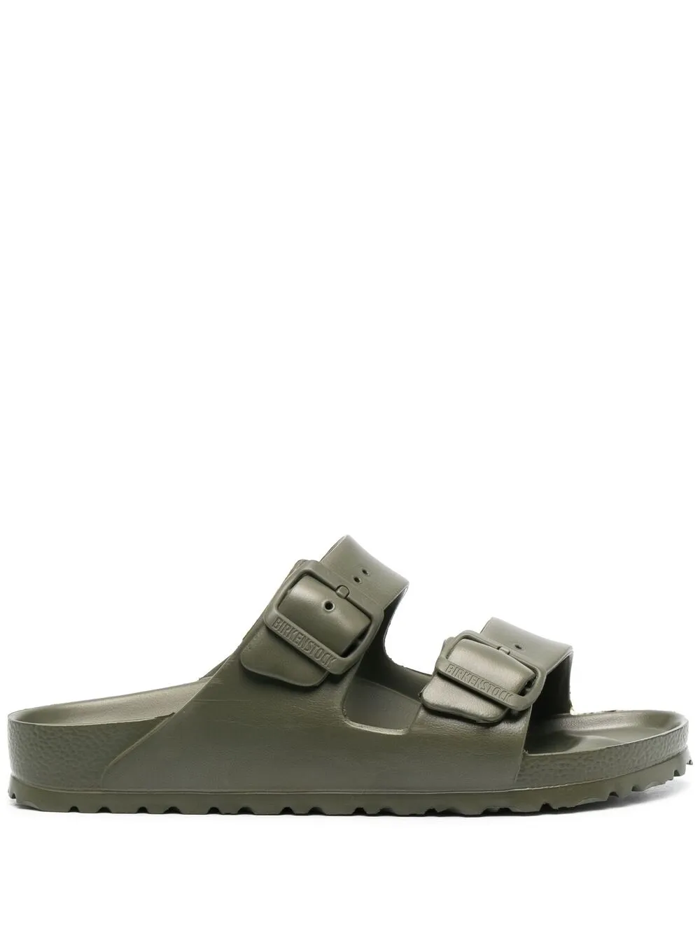 Military-green eco leather Eva eco leather sandals from BIRKENSTOCK featuring open toe, double buckle fastening, slip-on style, branded insole, moulded footbed and flat rubber sole. POSITIVELY CONSCIOUS: At least 50% of the main material of this product meets our conscious criteria. For example, it’s either organic, recycled, upcycled or independently recognised as being better for the environment (such as linen, ramie, TENCELâ„¢ etc.)..