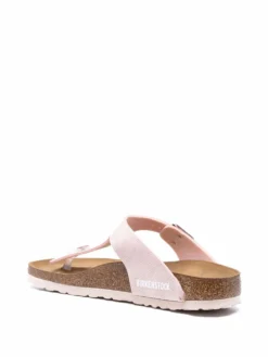 Pink leather Gizeh leather sandals from BIRKENSTOCK featuring grained texture, slip-on style, T-bar strap, open toe, moulded footbed, branded leather insole and flat rubber sole.