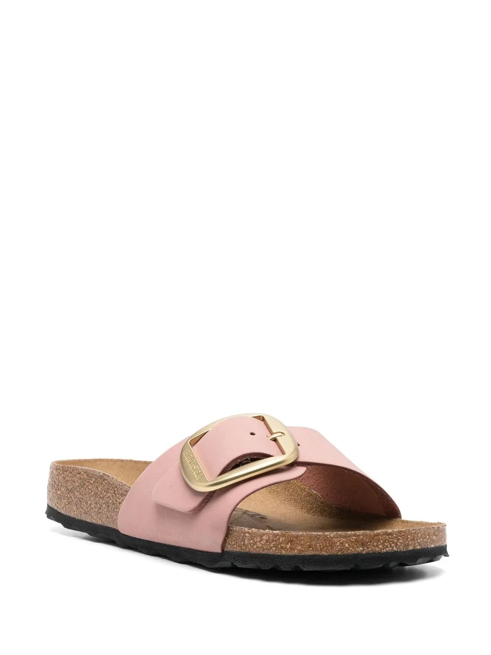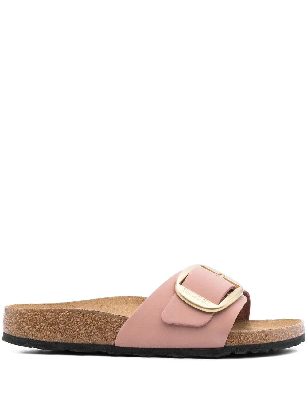Madrid buckle-fastening sandals from BIRKENSTOCK featuring pink, calf leather, single toe strap, gold-tone buckle fastening, open toe, open back, flat rubber sole, branded footbed and slip-on style.
