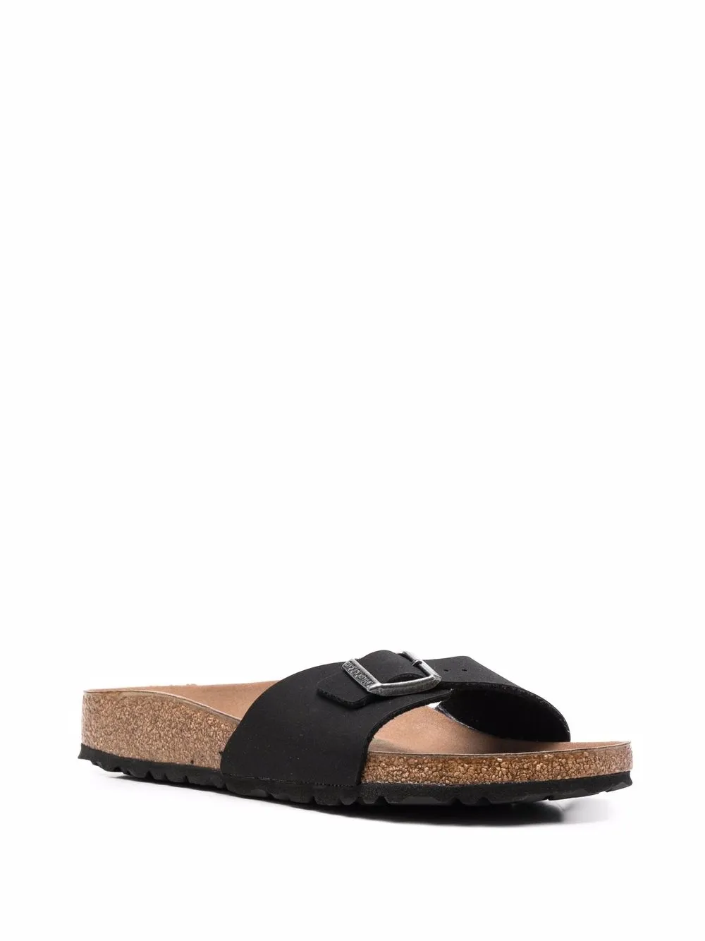 Black Madrid vegan sandals from BIRKENSTOCK featuring open toe, buckle detail at the toe, branded insole, cork platform sole and rubber outsole.