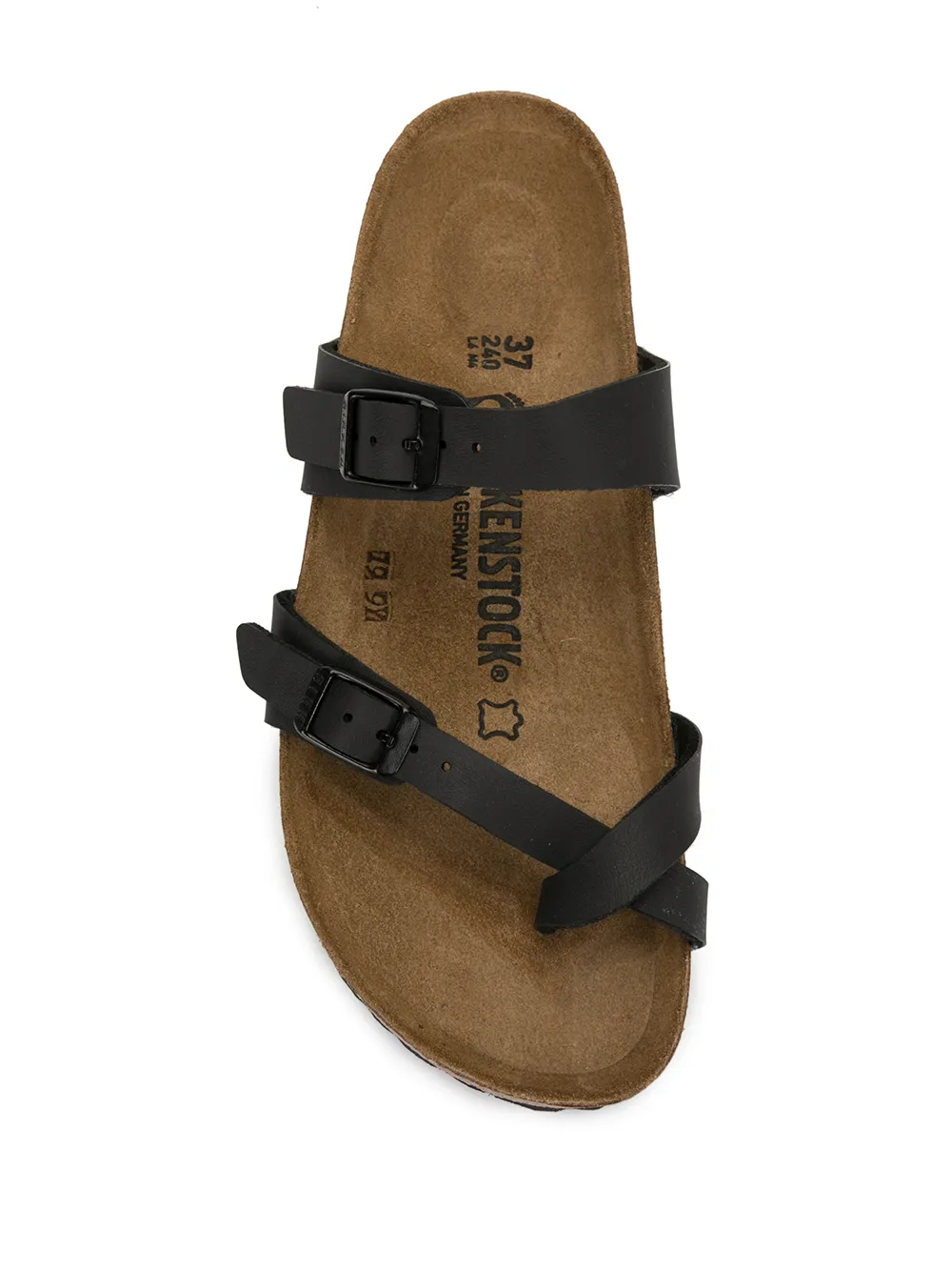Black artificial leather Mayari thong sandals from BIRKENSTOCK featuring thong style, slip-on style, double buckle fastening, branded insole, flat sole and suede lining. POSITIVELY CONSCIOUS: At least 50% of the main material of this product meets our conscious criteria: for example, it’s either organic, recycled, upcycled, or independently recognised as being better for the environment (such as linen, ramie, Tencel, etc.).