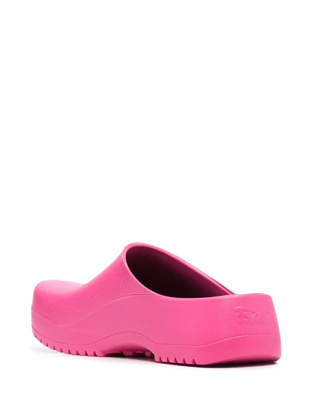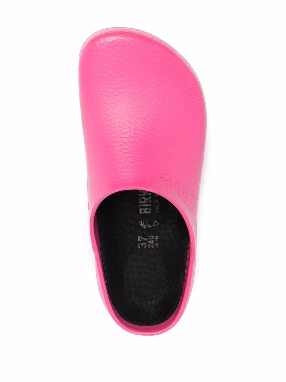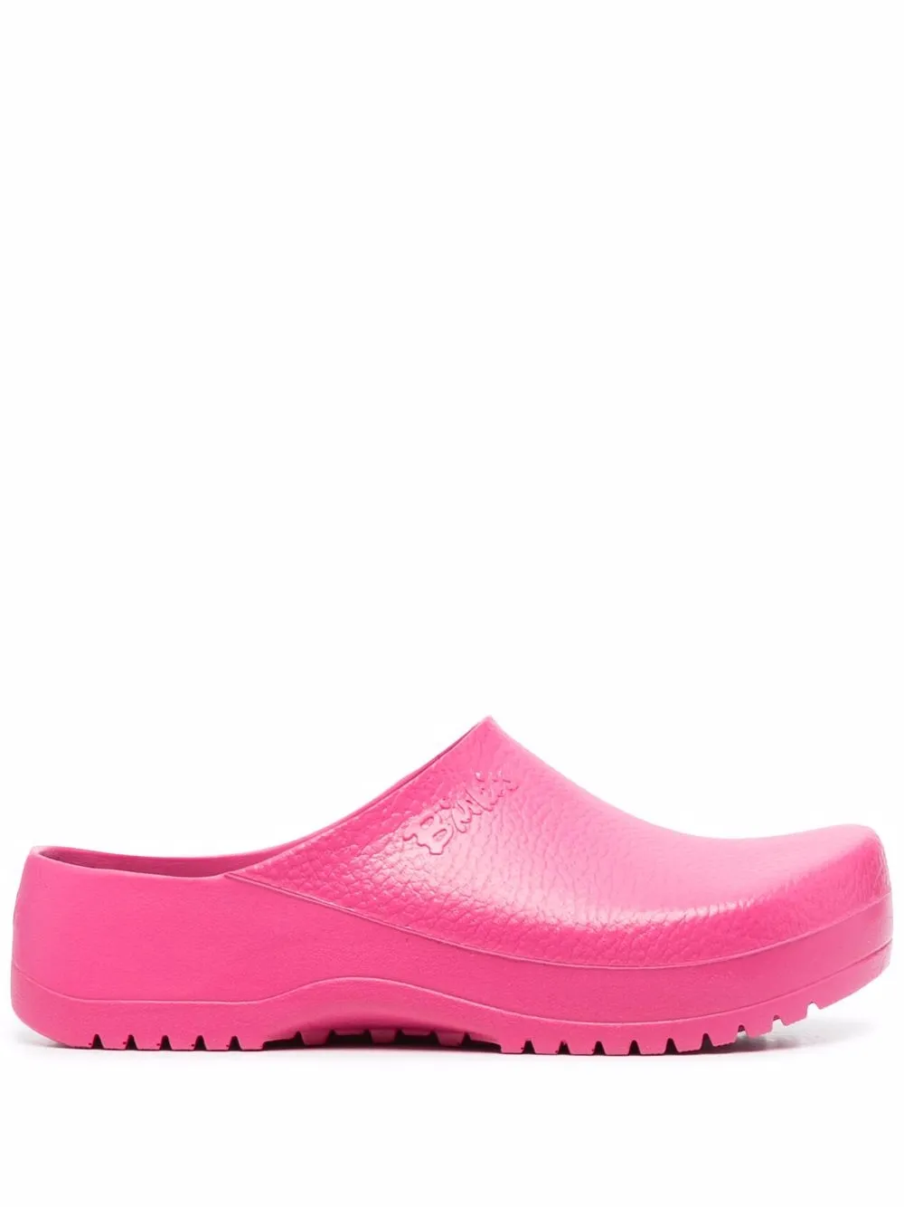 Raspberry pink slip-on clog sandals from BIRKENSTOCK featuring slip-on style, round toe, branded insole and flat rubber sole.